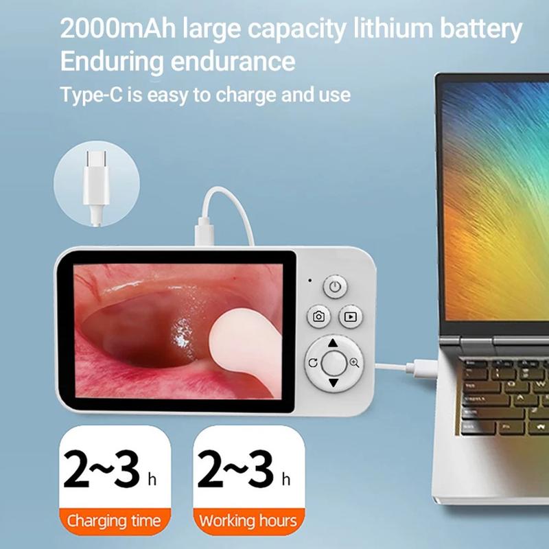 Equipado con una batería de litio de 2000mAh, el otoscopio ofrece entre 3 y 4 horas de uso continuo, ideal para realizar exámenes exhaustivos tanto en adultos como en niños.
