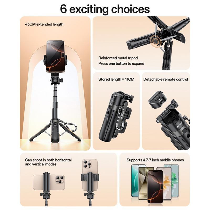 Capture todos sus viajes sin necesidad de equipos voluminosos. La YESIDO SF29 se pliega hasta 10 cm para llevarla en el bolsillo, se extiende hasta 43 cm y se convierte en un trípode estable de cuatro patas. Un mando a distancia Bluetooth desmontable y una pinza giratoria de 360 grados le permiten cambiar sin problemas entre vlogs de retratos, fotos de grupo de paisajes y transmisiones en directo con manos libres. Tanto si está recorriendo senderos de montaña como presentando productos en un escritorio, este ligero ayudante mantiene su teléfono estable y su creatividad fluyendo.