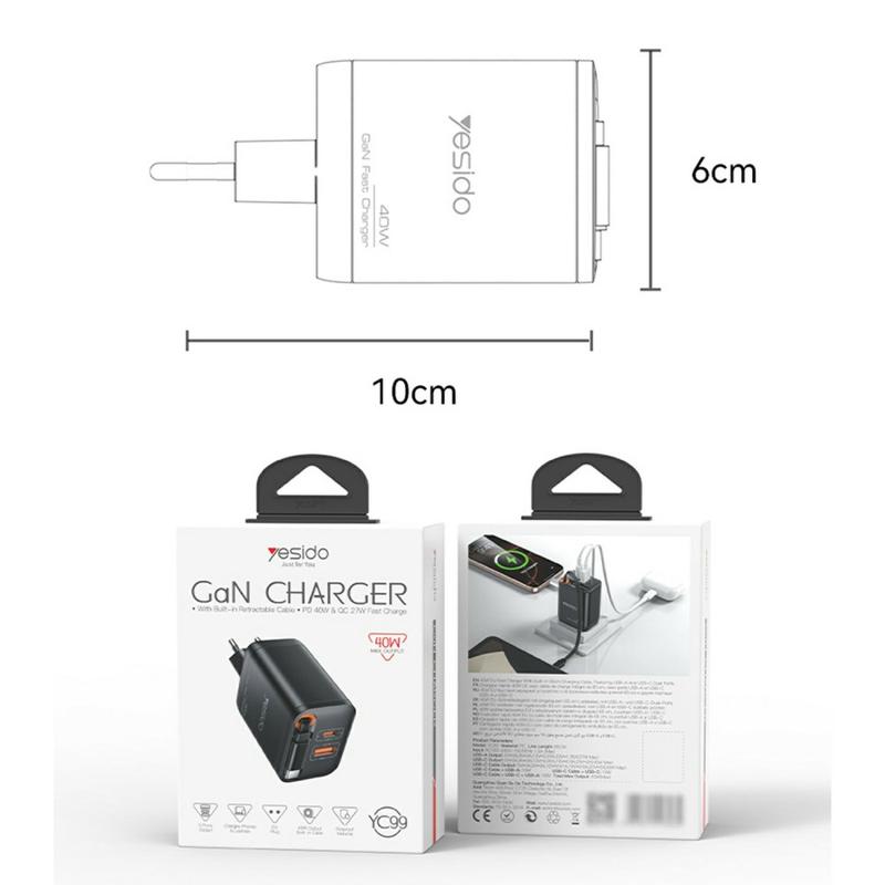 Cargue de forma más inteligente y rápida con el cargador rápido YESIDO YC99 40W GaN, una solución compacta y eficiente diseñada para los dispositivos modernos. Equipado con dos puertos, tecnología avanzada de nitruro de galio (GaN) y un cable retráctil integrado, combina potencia, comodidad y seguridad, y es perfecto para el hogar, la oficina o los viajes.
