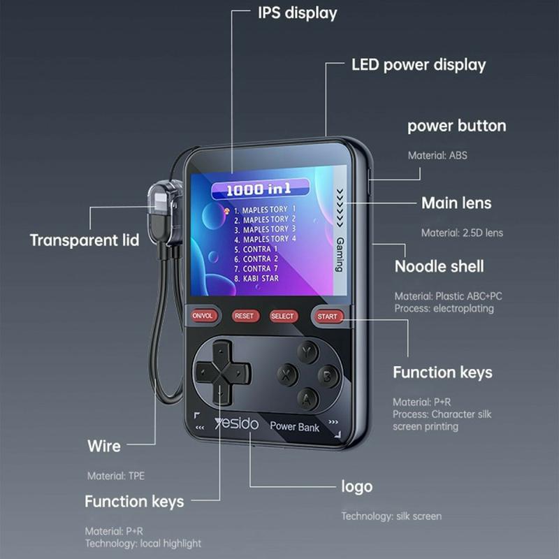 YESIDO YP87 es un exclusivo dispositivo 2 en 1 que combina una potente batería de 10000mAh con una videoconsola portátil retro. Diseñado para el entretenimiento y la carga diaria, te permite alimentar tus dispositivos mientras disfrutas de juegos clásicos en una vívida pantalla IPS de 2,8 pulgadas. Compacta y ligera, es la compañera ideal para viajes, desplazamientos y tiempos de inactividad.