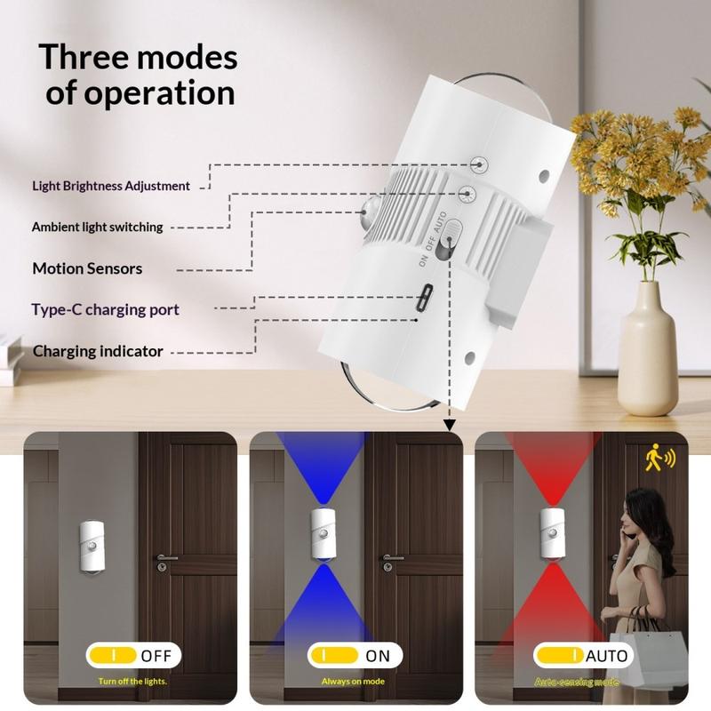 Su sistema de detección inteligente responde al movimiento en condiciones de poca luz, encendiéndose automáticamente y apagándose tras un breve retraso para ayudar a ahorrar energía. Con 4 niveles de brillo y múltiples modos de iluminación, puede utilizarse tanto como una práctica luz nocturna como una acogedora luz ambiental. El diseño de instalación magnética facilita su colocación, sin necesidad de taladrar ni de complicadas configuraciones.