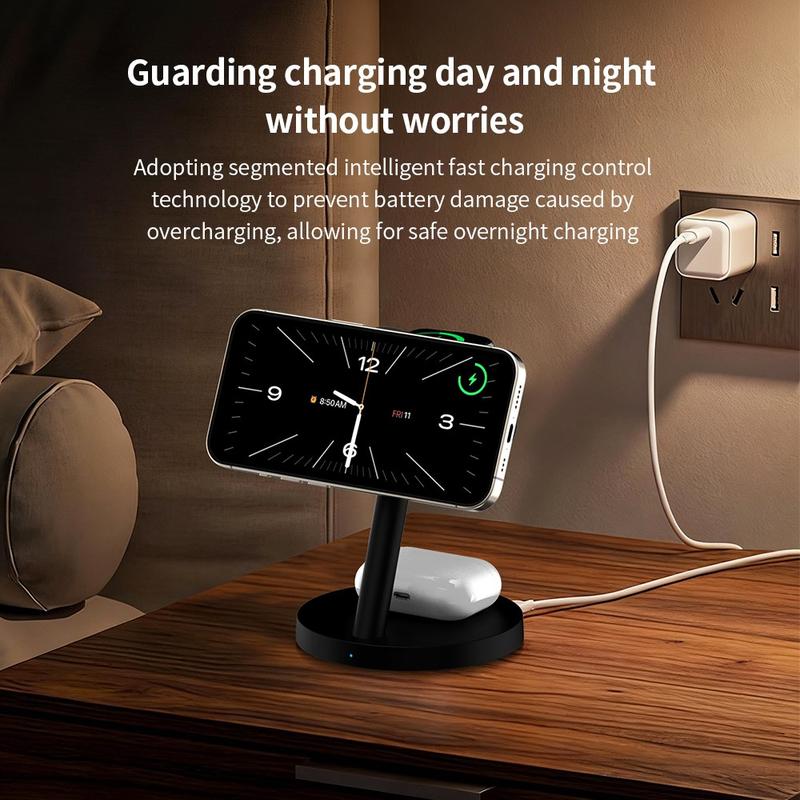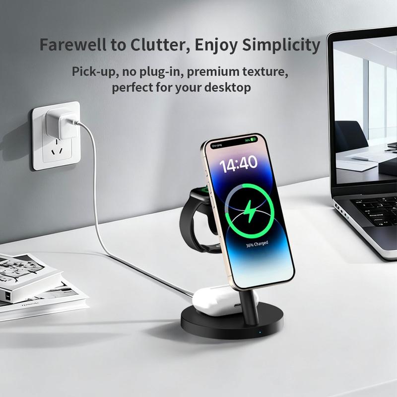 Los cargadores inalámbricos 3 en 1 son populares porque reducen el desorden de cables y hacen que la carga diaria sea más cómoda. Los soportes de carga magnéticos son especialmente útiles porque ayudan a colocar el teléfono en la posición correcta más fácilmente que una base de carga plana. Los modelos con soportes ajustables también facilitan consultar las notificaciones, utilizar el modo de espera o mantener la pantalla visible mientras se carga.